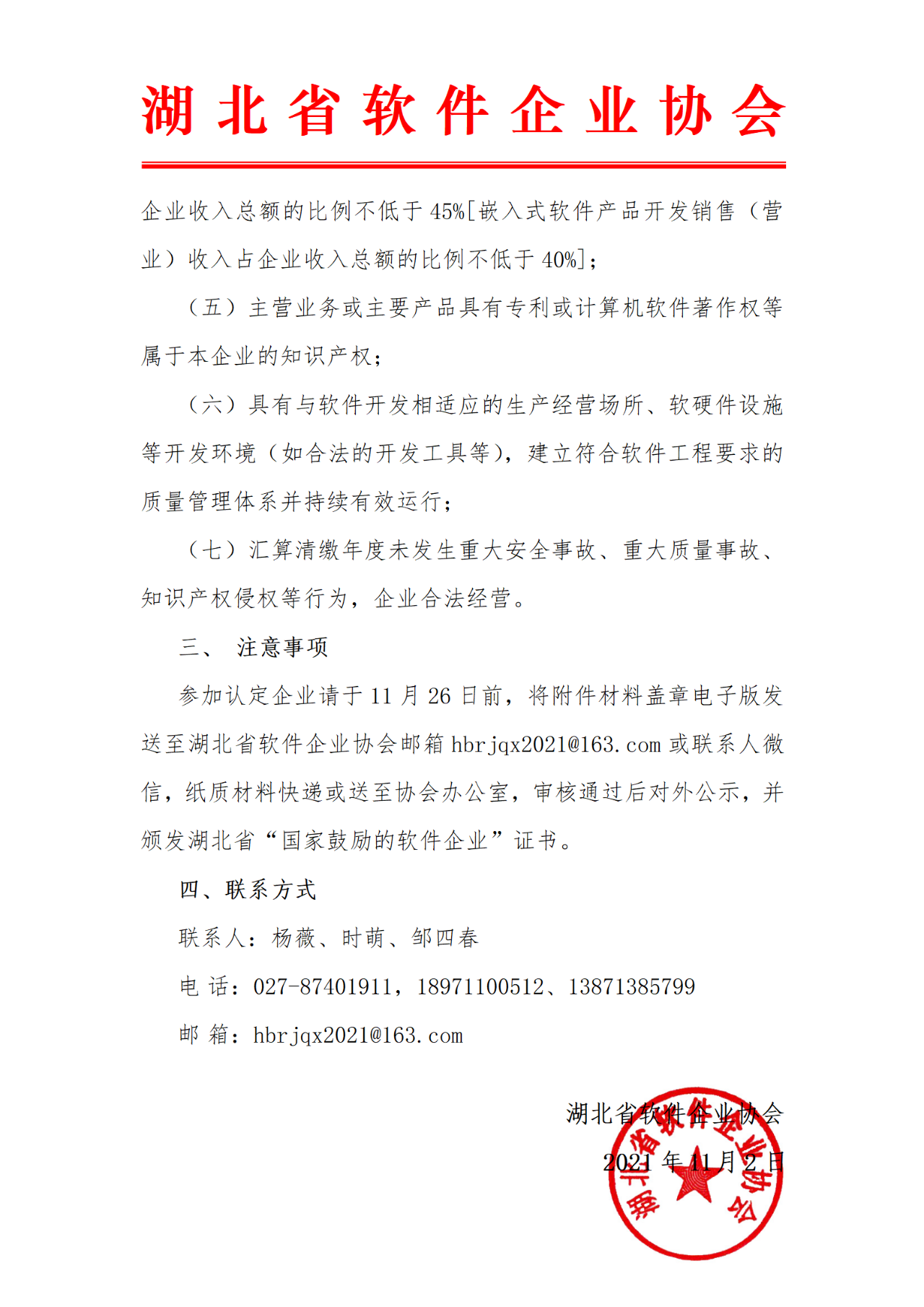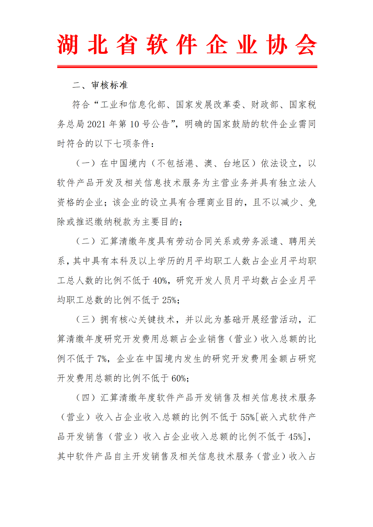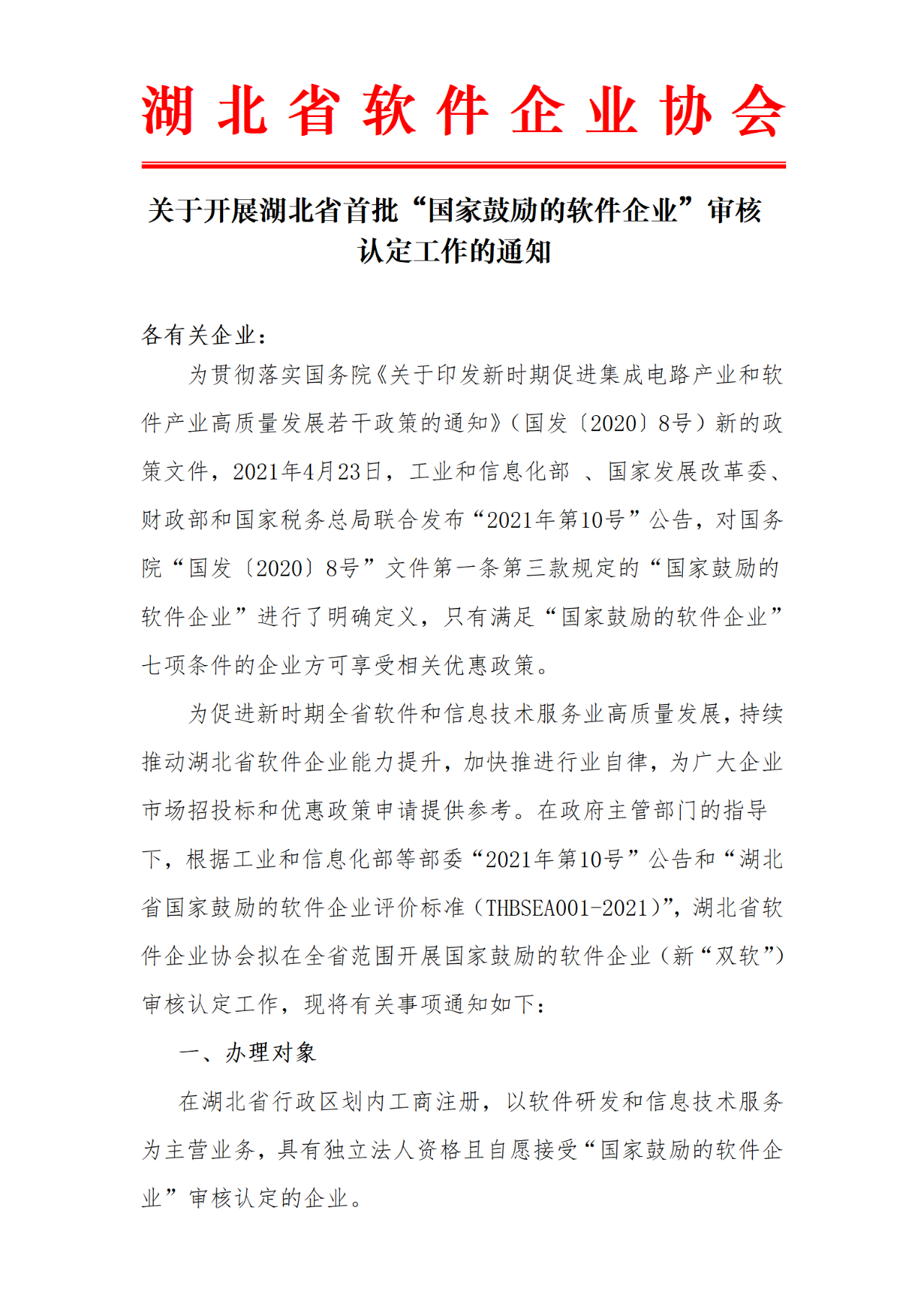 为促进新时期全省软件和信息技术服务业高质量发展,持续推动湖北省软件企业能力提升,加快推进行业自律,为广大企业市场招投标和优惠政策申请提供参考。在政府主管部门的指导下,根据工业和信息化部等部委“2021年第10号”公告和“湖北省国家鼓励的软件企业评价标准(THBSEA001-2021)”,湖北省软件企业协会拟在全省范围开展国家鼓励的软件企业(新“双软”)审核认定工作,现将有关事项通知如下: